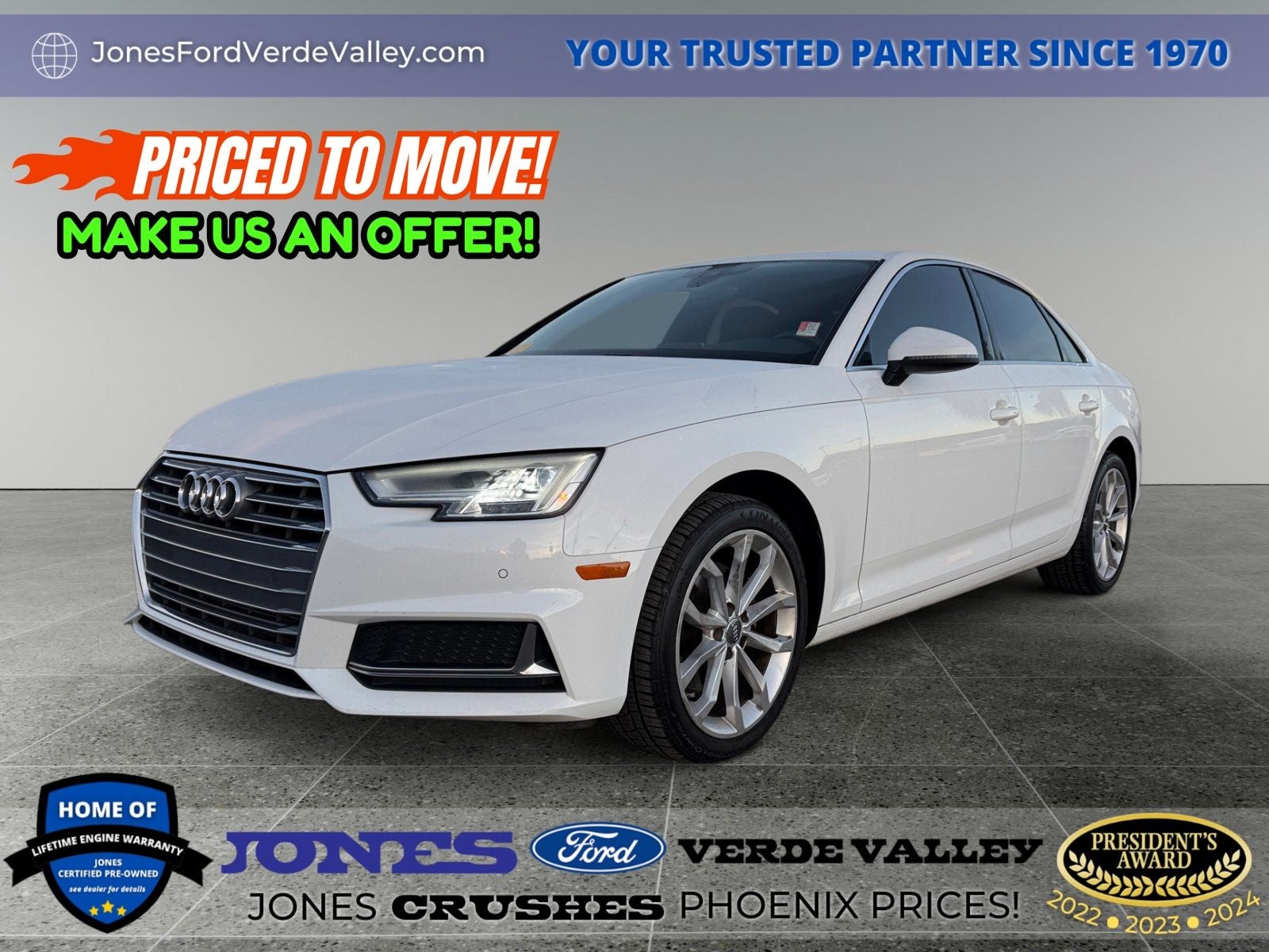 At Jones Ford Verde Valley we want you to know that all our vehicles are priced at a competitive value position to the market. We use an independent 3rd party software to research internet listings on all vehicles in the market so we can ensure that our prices are the most competitive out there. We do this simply so people choose us when they start searching for their next car. This car is well equipped with the following features: 18 Wheel Package (Wheels: 18 10-Spoke-V Design), Convenience Package (Alarm System w/Motion Sensor, Audi Advanced Key, Audi Pre Sense Rear, Audi Side Assist w/Rear Cross Traffic Assist, Auto-Dimming Exterior Mirrors, Memory for Driver's Seat, and SiriusXM Satellite Radio), Convenience Package Credit, Premium Plus Package (Audi Connect PRIME & PLUS, Audi MMI Navigation Plus w/MMI Touch, Audi Virtual Cockpit, Leatherette Covered Center Console & Door Armrests, LED Headlights, and Parking System Plus), 10 Speakers, 4-Wheel Disc Brakes, ABS brakes, Air Conditioning, Alloy wheels, AM/FM radio, Anti-whiplash front head restraints, Audi Beam-Rings, Audi First Aid Kit, Audi smartphone interface (Apple CarPlay/Android Auto), Auto-dimming Rear-View mirror, Automatic temperature control, Brake assist, Bumpers: body-color, Collapsible Fabric Audi Trunk Cargo Storage Box, Compass, Delay-off headlights, Driver door bin, Driver vanity mirror, Dual front impact airbags, Dual front side impact airbags, Electronic Stability Control, Emergency communication system: Audi connect CARE, Exterior Parking Camera Rear, Four wheel independent suspension, Front anti-roll bar, Front Bucket Seats, Front Center Armrest, Front dual zone A/C, Front fog lights, Front reading lights, Garage door transmitter: HomeLink, Genuine wood console insert, Genuine wood dashboard insert, Genuine wood door panel insert, Heated door mirrors, Heated Front Bucket Seats, Heated front seats, High intensity discharge headlights: Xenon plus, Illuminated entry, Knee airbag, Leather Seating Surfaces, Leather Shift Knob, Leather steering wheel, Low tire pressure warning, Occupant sensing airbag, Outside temperature display, Overhead airbag, Overhead console, Panic alarm, Passenger door bin, Passenger vanity mirror, Power door mirrors, Power driver seat, Power moonroof, Power passenger seat, Power steering, Power windows, Radio data system, Radio: Audi Sound System, Rain sensing wipers, Rear air conditioning, Rear anti-roll bar, Rear fog lights, Rear Load Sill/Door Cup/Door Edge Paint Protection, Rear reading lights, Rear seat center armrest, Rear window defroster, Remote CD player, Remote keyless entry, Speed control, Speed-sensing steering, Speed-Sensitive Wipers, Split folding rear seat, Steering wheel mounted audio controls, Tachometer, Telescoping steering wheel, Tilt steering wheel, Traction control, Trip computer, Turn signal indicator mirrors, USB Cables
