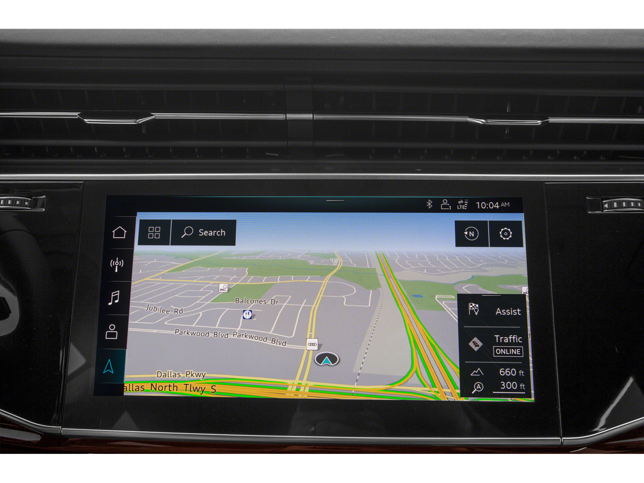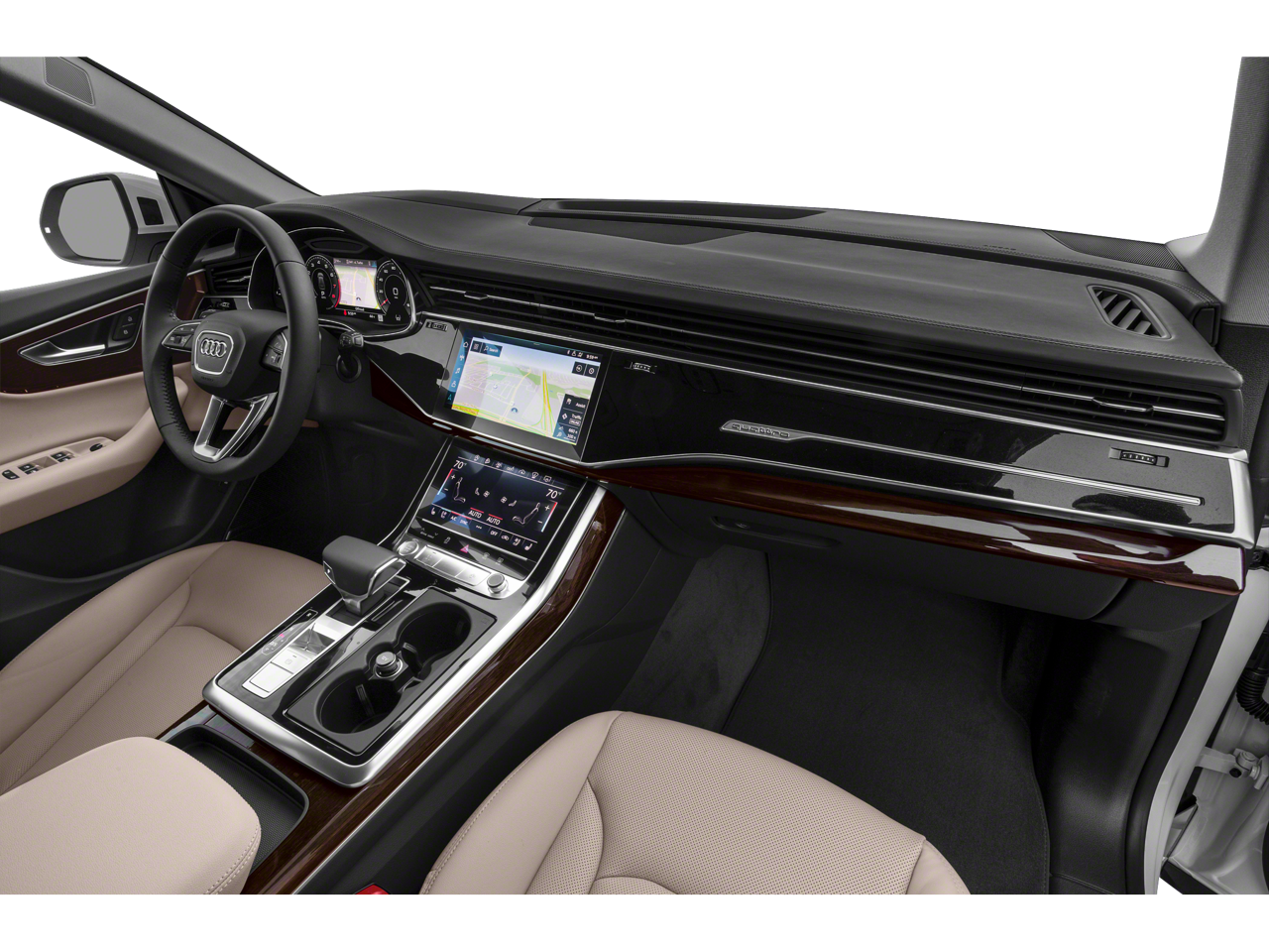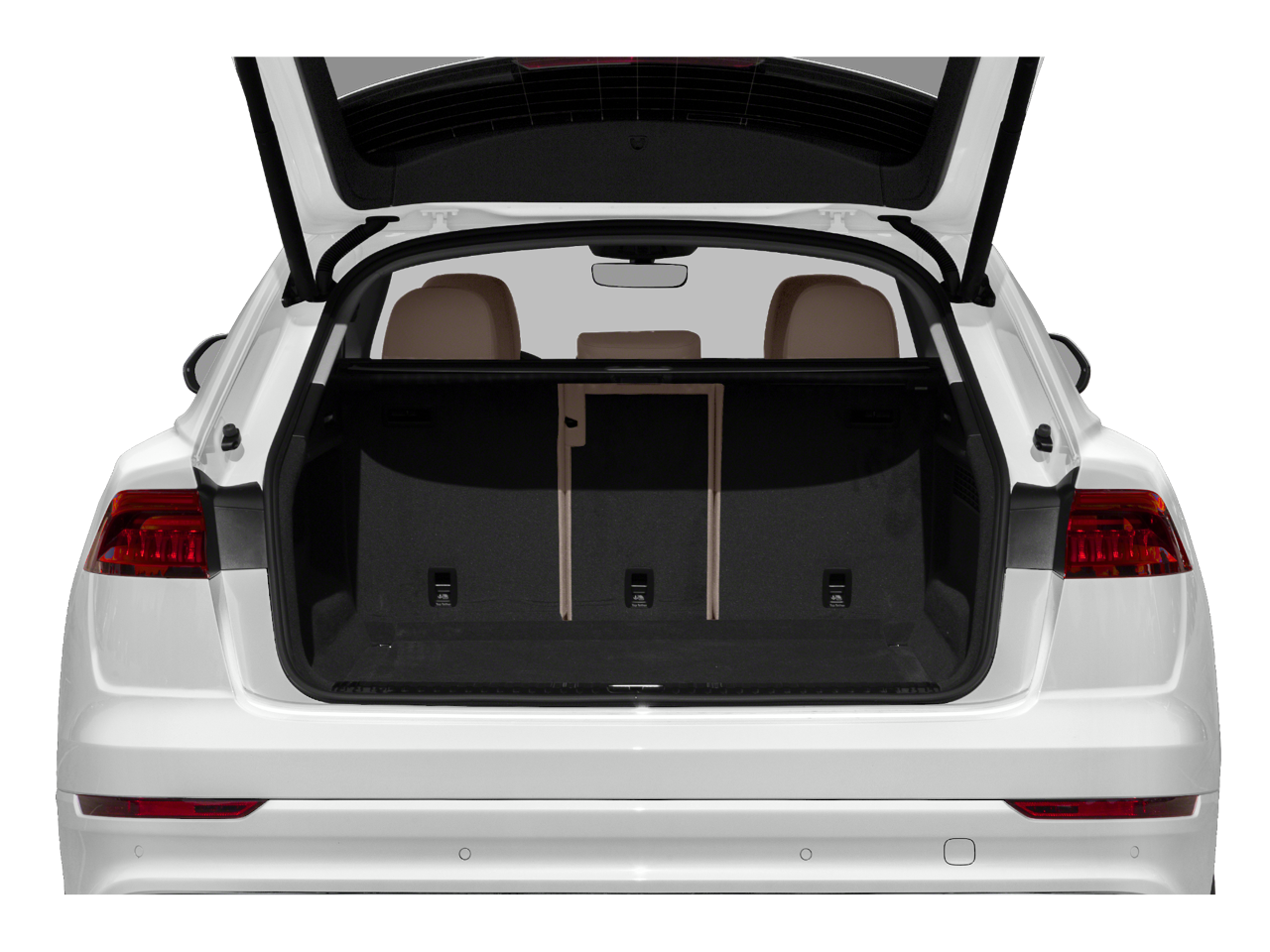 This car is well equipped with the following features: 10 Speakers, 21 5-Segment-Spoke-Design Wheels, 4-Wheel Disc Brakes, ABS brakes, Adaptive suspension, Air Conditioning, Alloy wheels, AM/FM radio: SiriusXM, Audi smartphone interface (Apple CarPlay/Android Auto), Auto High-beam Headlights, Auto-dimming door mirrors, Auto-dimming Rear-View mirror, Automatic temperature control, Axle Ratio: TBD, Brake assist, Bumpers: body-color, Compass, Delay-off headlights, Driver door bin, Driver vanity mirror, Dual front impact airbags, Dual front side impact airbags, Electronic Stability Control, Emergency communication system: Audi connect CARE, PRIME & PLUS, Exterior Parking Camera Rear, Four wheel independent suspension, Front anti-roll bar, Front Bucket Seats, Front Center Armrest, Front dual zone A/C, Front fog lights, Front reading lights, Fully automatic headlights, Garage door transmitter: HomeLink, Genuine wood door panel insert, Heated door mirrors, Heated Front Bucket Seats, Heated front seats, Illuminated entry, Leather Seating Surfaces, Leather Shift Knob, Leather steering wheel, Low tire pressure warning, Memory seat, Navigation system: Audi MMI Navigation plus with Touch Response, Occupant sensing airbag, Outside temperature display, Overhead airbag, Overhead console, Panic alarm, Passenger door bin, Passenger vanity mirror, Power door mirrors, Power driver seat, Power Liftgate, Power moonroof: Panoramic, Power passenger seat, Power steering, Power windows, Radio data system, Radio: MMI Nav Plus w/MMI Touch Response, Rain sensing wipers, Rear air conditioning, Rear anti-roll bar, Rear fog lights, Rear reading lights, Rear seat center armrest, Rear side impact airbag, Rear window defroster, Rear window wiper, Remote keyless entry, Roof rack: rails only, Security system, Speed control, Speed-sensing steering, Split folding rear seat, Spoiler, Steering wheel memory, Steering wheel mounted audio controls, Tachometer, Telescoping steering wheel, Tilt steering wheel, Traction control, Trip computer, Turn signal indicator mirrors, and Variably intermittent wipers.